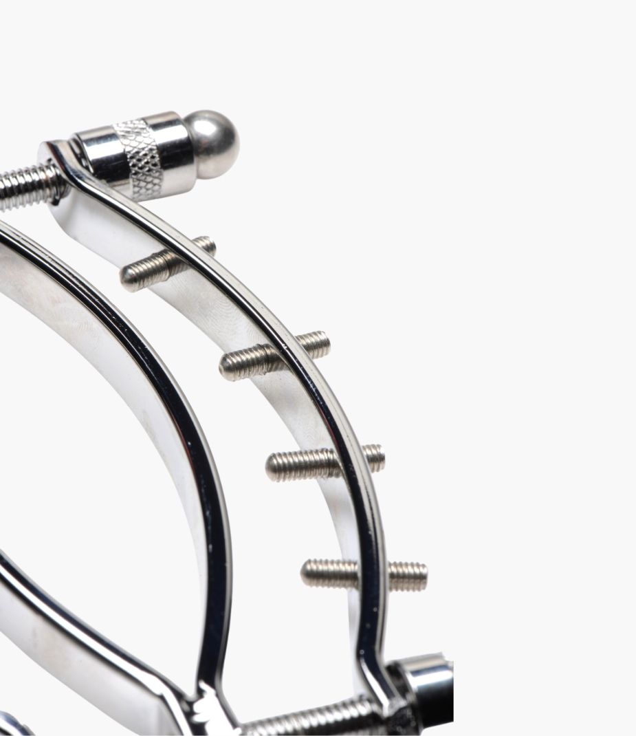 Engineered to hold the labia majora in place, the clamp uses top and bottom compression screws to gently but firmly secure the tissue. Along the sides, eight customizable pressure screws can be adjusted using the included Allen wrench to apply focused pressure along the labia. This creates a unique blend of intimate stretching, sensitivity training, and erotic display.